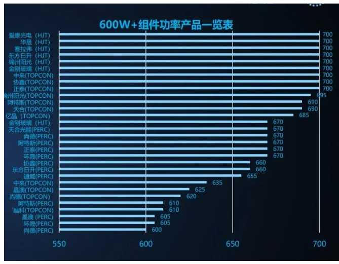 光伏组件功率不断提升是光伏发电度电成本持续降低的核心要素之一,也是光伏行业发展的必然趋势。2021年3月,天合光能发布至尊670W组件,引领行业进入PV 6.0时代。今年5月在德国举办的Intersolar Europe展会上,10余家组件制造商展示了600W+新产品。刚刚结束的Intersolar South American展会上,展出600W产品的组件供应商已经有近30家。集邦新能源近期发布的一份行业报告则显示,主流光伏企业已经全面迈入600W +时代,而使用PERC、HJT、TOPCon等不同技术的600W+产品多达40余种。600W+高功率组件更高的客户价值和更低的度电成本优势是600W+正成为行业主流的核心驱动力。