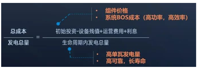 相较于目前行业的一般参考组件,600W+组件的功率提升了125W-130W,组件效率提升了0.3%-0.5%。根据度电成本计算模型,初始投资与度电成本成正比,而初始投资又与组件价格、系统BOS成本正相关。