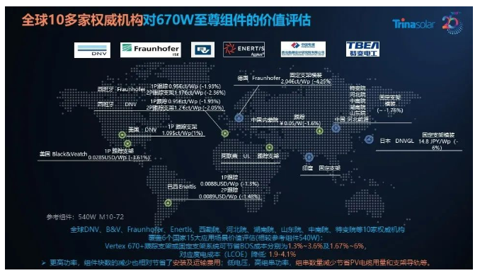 600W+组件的系统价值也得到了权威第三方机构的验证。根据欧洲权威机构Fraunhofer ISE研究分析,在德国地面电站场景中,至尊670W组件可节省系统BOS成本高达2.05欧分/W。除此之外,DNV、拉美Enertis、北美Black&Veatch、西勘院等十余家国内外权威机构在全球范围内对600W+高功率组件进行了广泛的价值分析,覆盖了15大应用场景。结果显示,与市面上一般的540W组件相比,至尊670W组件最多可节省BOS成本6%,对应度电成本(LCOE)最多可降低4.1%。600W+组件的系统价值在分布式应用场景也充分彰显,以中国的工商分布式项目为例,600W+组件可节省系统BOS初始投资成本超人民币4分/W,而在户用场景,600W+组件的系统价值更加突出,可节省初始投资超人民币6分/W。