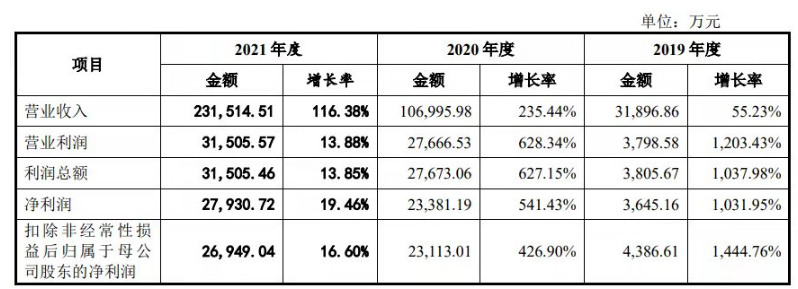 招股书显示,过去三年,公司的营业收入分别为3.19亿元、10.7亿元和23.15亿元,同比增速分别为55.23%、235.44%和116.38%,年均复合增速达到124.18%;净利润方面,则达到0.36亿元、2.34亿元和2.79亿元,年均复合增速达到296.06%。