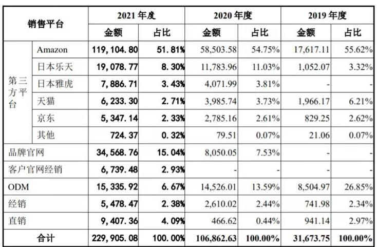 渠道上,华宝新能则主要通过亚马逊、日本乐天、日本雅虎等第三方平台销售产品。2019年至2021年,公司通过这些第三方电商平台获得的线上销售额占总营收比重分别为67.83%、75.99%和68.89%。其中,仅来自亚马逊的线上销售额占总营收的比例就达到了51.81%,占据半壁江山。