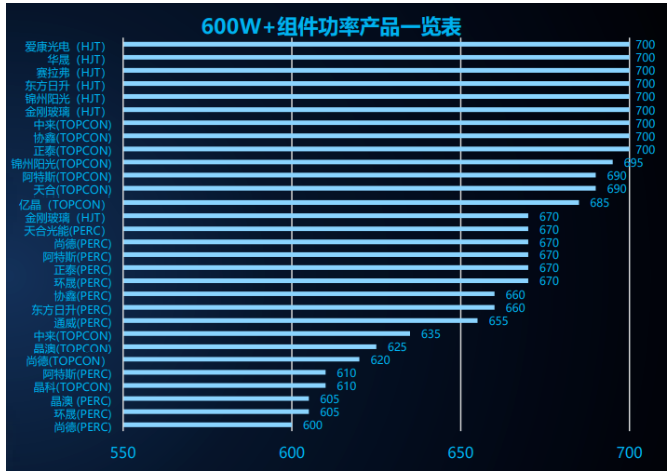 从今年重要的行业展会各主流组件制造商展出的新品和各主流组件厂量产的产品来看,600W+均已成为大势。从5月的Intersolar Europe到8月底在巴西举办的Intersolar South American,展出600W+产品的组件制造商从10余家增加到近30家。使用不同技术、不同版型的600W+产品已接近40余种。
