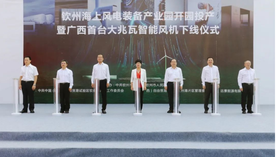 9月23日,广西钦州海上风电装备产业园投产、首台大兆瓦智能风机下线,由远景钦州智慧能源产业基地生产的大兆瓦智能风机将陆续发往广西各地。