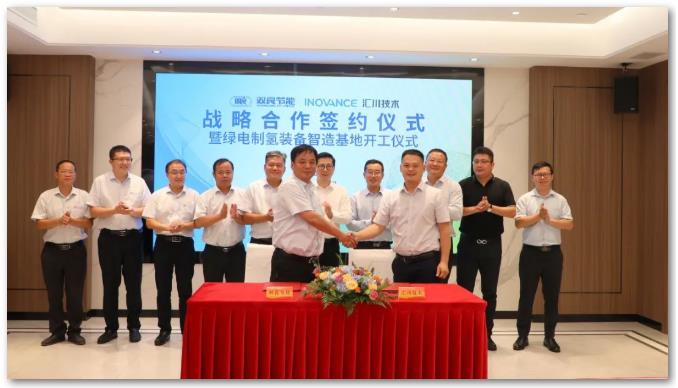 仪式当天,双良节能与汇川技术有限公司(简称“汇川技术”)就绿电制氢签订战略合作,作为工业自动化控制与驱动技术的领军者,汇川技术后续将与双良共同研发高效、智能的功率器件以及电源解决方案,赋能双良大功率绿电制氢系统。未来,双方将充分发挥各自资源优势,创新合作机制,拓宽合作领域,共同推动绿电事业健康发展。