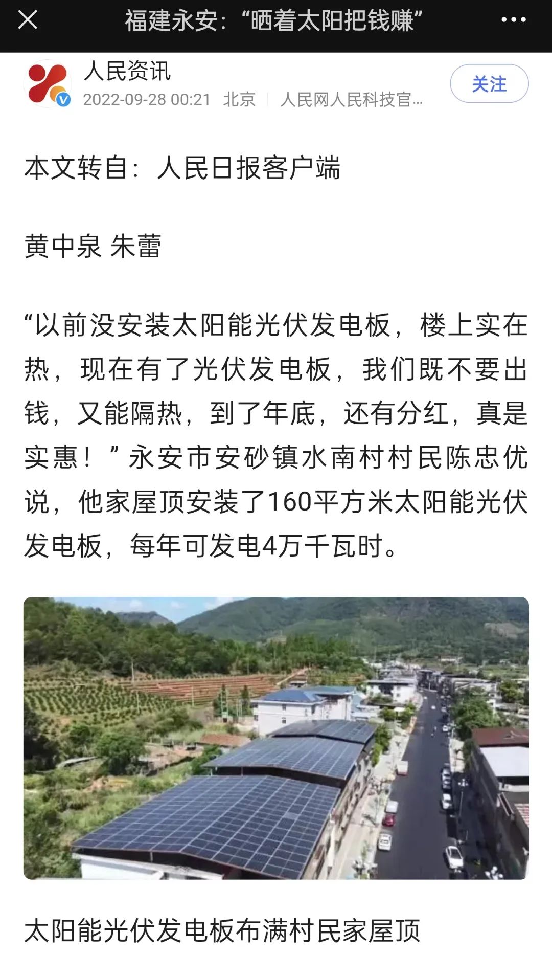 同一天9月28日,另一重磅媒体人民日报客户端登载了《福建永安:“晒着太阳把钱赚”》,文章中表述,通过创维光伏的屋顶分布式发电项目,福建永安加快了光伏发电在农村的普及应用,通过推广安装屋顶太阳能光伏发电板,切实让村民们实实在在享受到光伏发电带来的“阳光收益”。