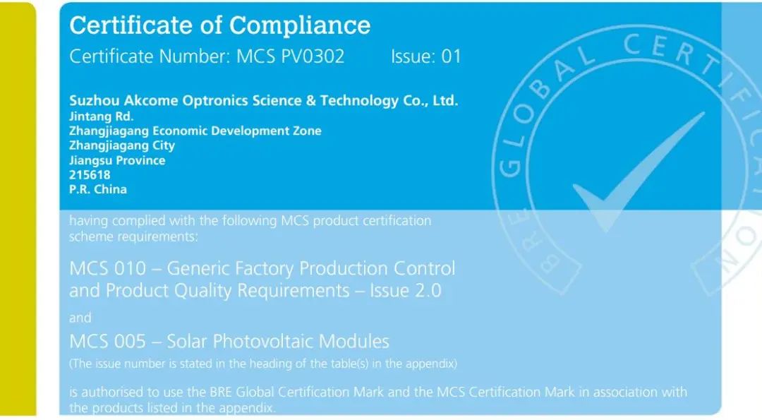 喜不自禁!爱康单玻、双玻系列组件获得英国MCS认证!