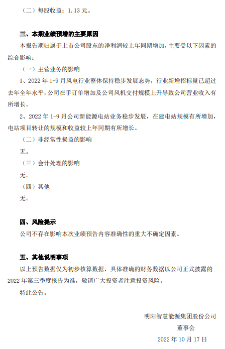 10月16日,明阳智能发布业绩预告,预计2022年1-9月实现净利润为33亿元到36.5亿元,与上年同期相比将增加约11.39亿元到约14.89亿元,同比增长52.68%到68.88%。对于本期业绩预增的原因,公告称,今年1-9月风电行业整体保持稳步发展态势,行业新增招标量已超过去年全年水平,公司在手订单增加及公司风机交付规模上升导致公司营业收入有所增长。同时,前三季度公司新能源电站业务稳步发展,在建电站规模有所增加,电站项目转让的规模和收益较上年同期有所增长。