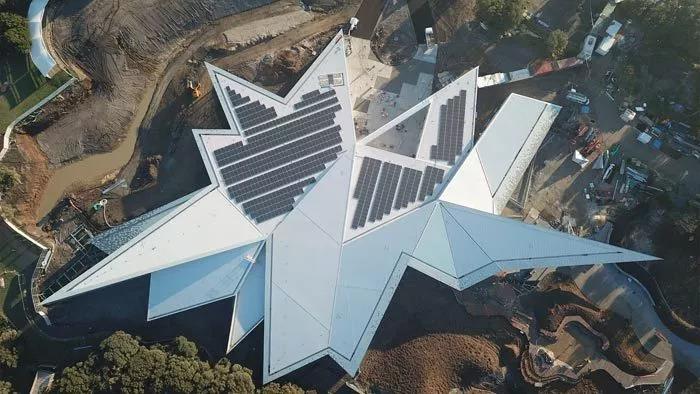 在对建筑美学的极致追求的同时,尽一切可能为环保做出贡献,也成为建造企鹅岛新游客中心的重要诉求之一。为实现2030年企鹅岛的碳中和目标,该建筑整体采用低碳材料,并安装屋顶光伏发电系统——主体为666块天合光能Honey系列单晶组件,系统输出功率超过200千瓦。