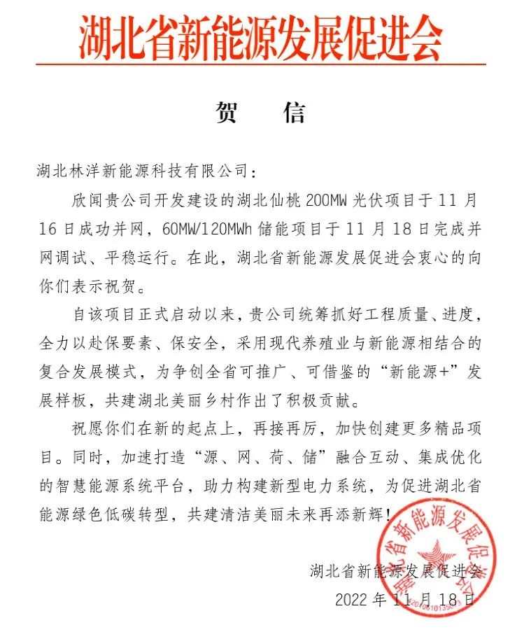 项目并网后,湖北省新能源发展促进会第一时间发来贺信,充分肯定林洋项目对于湖北省新能源产业发展做出的积极贡献!