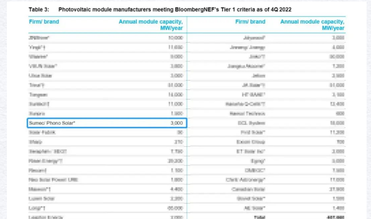 全球光伏一级组件供应商榜单(BNEFTier 1List)是彭博新能源财经根据各主要太阳能光伏组件制造商在可融资性方面的综合表现构建的一套全球市场光伏组件供应商评级体系,旨在对全球范围内数百家光伏组件企业中做出透明化区分。彭博新能源财经(BNEF)是全球新能源市场上最具公信力的第三方研究机构之一,因其严苛的评选机制,Tier1 List长期以来被作为光伏企业竞争力分析极具可信度的参考资料,广受国际金融机构认可而作为开展信贷业务的重要依据。