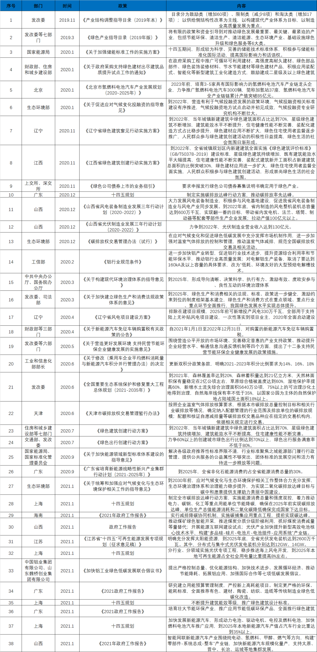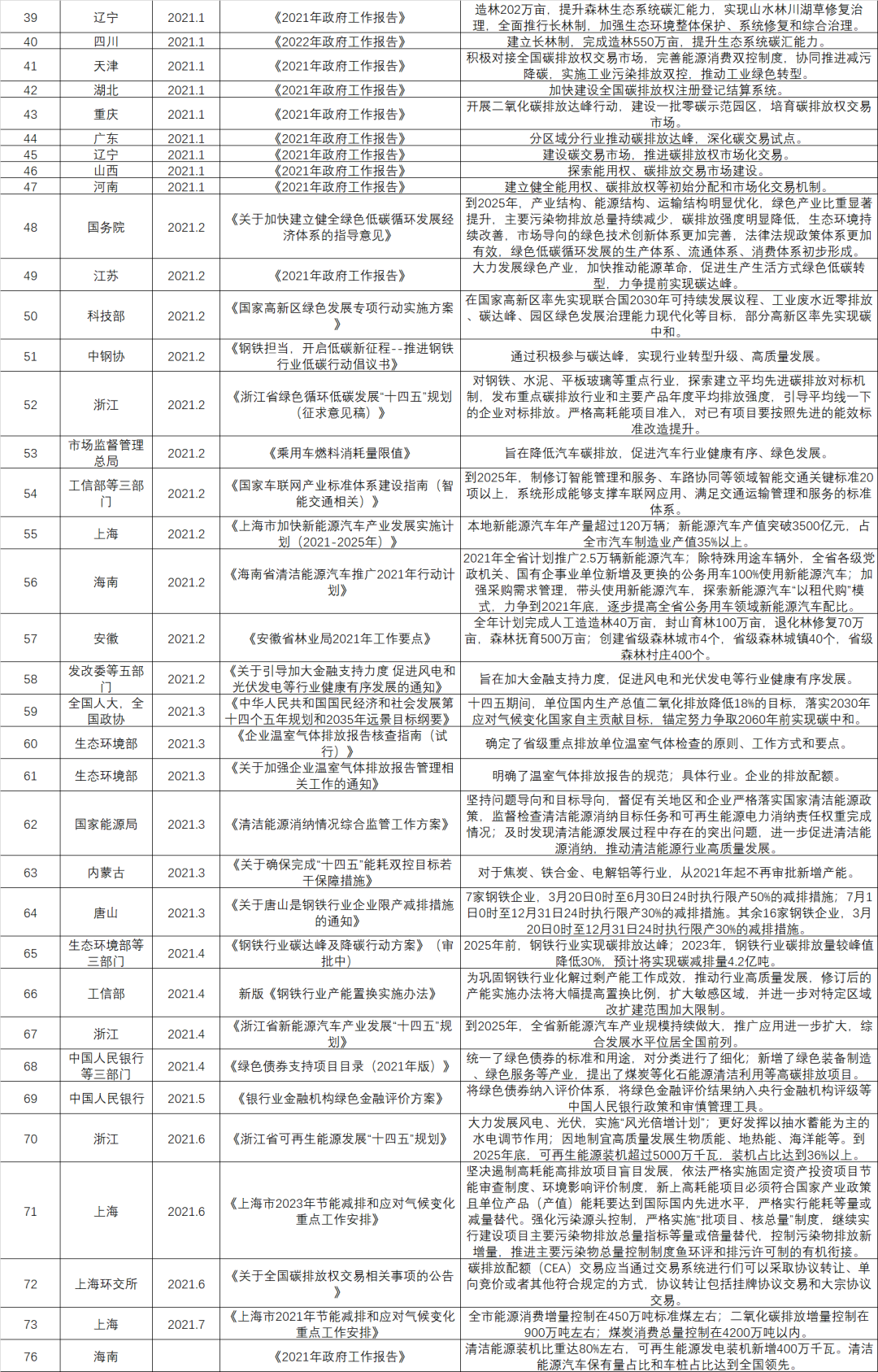 目前我国已初步建立起“碳中和”政策体系雏形,以国家“碳中和”战略为总纲领,各相关部委、行业协会、地方政府相继出台政策,具体来看,包括生态环境部制定的《企业温室气体排放报告核查指南(试行)》、发改委制定的《绿色产业指导目录》、国家能源局制定的《关于加强储能标准化工作的实施方案》以及工信部制定的新版《钢铁行业产能置换实施办法》等。