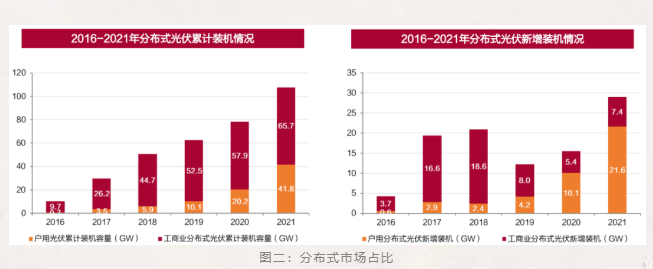 对于企业来说,尤其是高耗能企业,要实现碳达峰、碳中和目标,一是优化产业布局和流程结构,淘汰落后工艺和产能。二是按照开源、降耗、节能、增效的原则,积极的开展新能源的配套建设,尤其是光伏新能源的的建设,一方面弥补企业碳排放的配额,另外还可以起到增加企业收入、节省峰值电费、阻隔热量防御严寒等作用。各大政策也对光伏行业重大利好,我国的光伏年装机容量也是逐年增加,特别是分布式市场,2021年分布式装机容量29GW,首次超过了集中式电站容量,22年预计预计分布式将达到50GW。