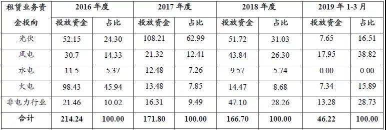 按照租赁客户所属业务板块划分,融和租赁融资租赁业务主要涉及光伏发电、风电、水电、火电以及非电力行业等五大板块。租赁业务构成情况如下: