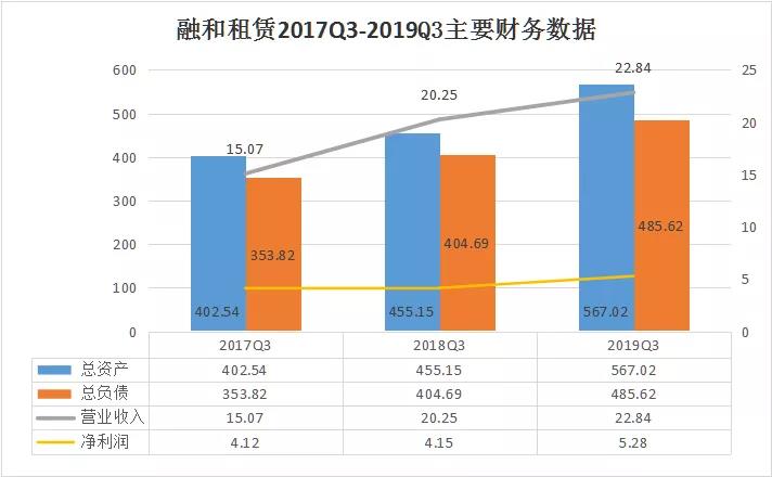 截至2019年9月末,融和租赁总资产567.02亿元,总负债485.62亿元,实现营业收入22.84亿元,同比增长12.79%;净利润5.82亿元,同比增长27.11%。净资产收益率7.39%。