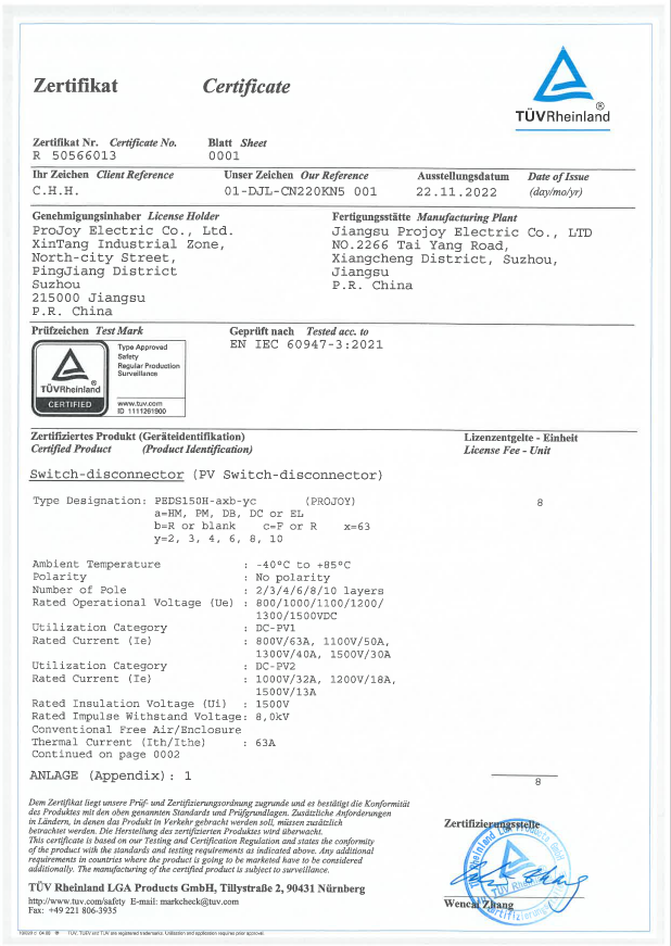 新型PEDS150H系列直流隔离开关已通过EN/IEC 6-947-3:2021标准测试,取得TUV认证,表明该产品正式获国际品质认证机构背书。