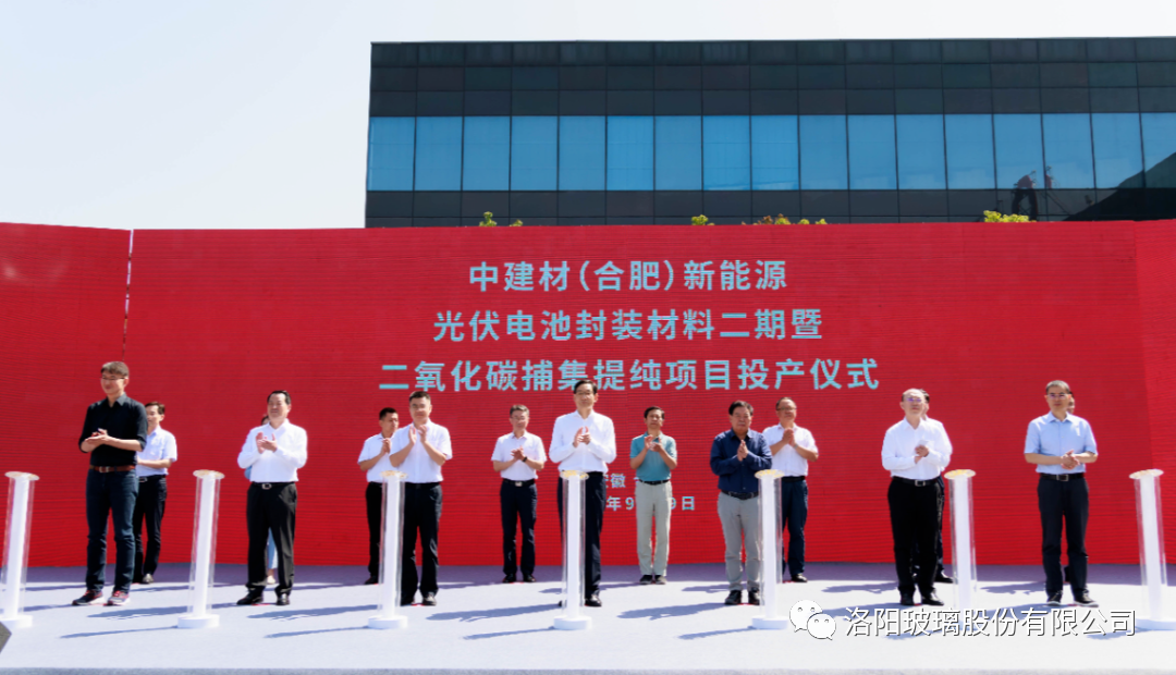 合肥新能源光伏电池封装材料二期暨二氧化碳捕集提纯项目于9月19日举行投产仪式。中国建材集团有限公司党委书记、董事长、中国建材股份党委书记、董事长周育先在启动投产仪式上指出:中建材(合肥)新能源光伏电池封装材料二期暨二氧化碳捕集提纯项目是世界首套玻璃熔窑二氧化碳捕集与提纯示范项目,是凯盛科技集团继全球最大全氧燃烧光伏玻璃生产线后,首次将自主研发的玻璃熔窑二氧化碳捕集与提纯技术应用在玻璃生产线,填补了行业空白,再次创造了光伏玻璃行业的“国内第一、世界首创”。
