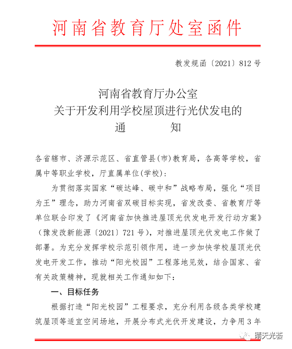 《通知》期于充分利用各级各类学校建筑屋顶等适宜空间场地,开展分布式光伏开发建设,力争用3年左右时间,大幅提高学校分布式光伏发电规模,发挥示范带动效应。鼓励推动各级各类学校充分利用屋顶资源开展光伏发电建设,重点支持在大中专院校结合专业设置,开展光伏发电建设应用,打造特色示范基地。《通知》旨在通过“光伏进校园”的方式,推动当地新能源的使用,加快能源结构的转型调整,助力国家早日达成碳达峰碳中和的目标。
