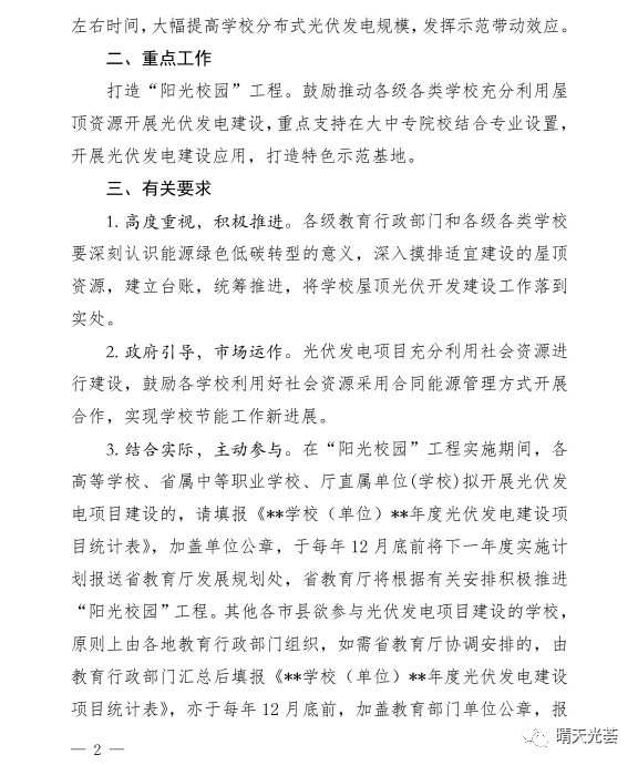 本次绿色校园项目,是晴天科技为响应国家“整县推进”政策,结合河南省教育厅发布的《关于开发利用学校屋顶进行光伏发电的通知》(以下简称《通知》)文件的精神,与当地教育局、招商局、区党工委员会等部门联合推出的光伏试点开发项目。通过光伏进校园的方式,充分开发学校屋顶,打造“阳光校园”。