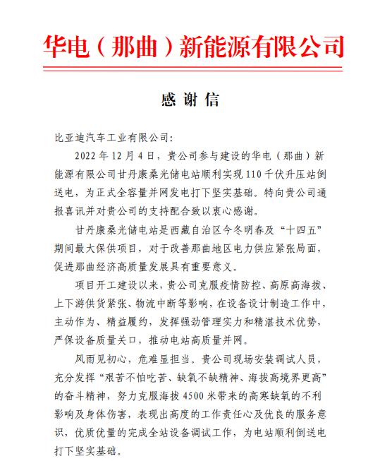 2022年12月4日,比亚迪储能参与建设的华电(那曲)新能源有限公司甘丹康桑光储电站顺利实现 110 千伏升压站运行,为电站正式全容量并网发电打下坚实基础。