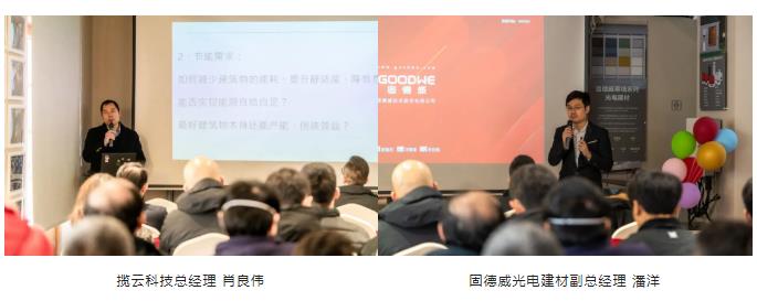 现场举办了建筑光伏一体化应用主题沙龙,揽云科技总经理肖良伟和固德威光电建材事业部副总经理潘洋,分别从上海展示中心本身的建筑光伏应用实例以及光电建筑整体解决方案两个主题进行分享,为来宾详细展示了建筑光伏一体化应用。