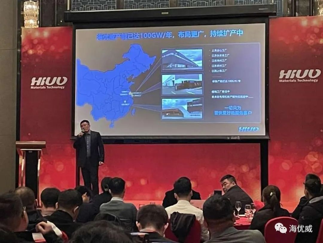同时,海优威也为与会嘉宾介绍了公司光伏胶膜产能情况及新产品进展。公司首席市场营销官周晓峰先生做了《从海优威产能布局到粒子供求》,向大家详细介绍了公司产能布局,并分析了在未来POE粒子和EVA粒子供求的关键变量;资深产品经理别红玲女士做了《新型电池组件封装解决方案》,向大家介绍公司近期新型胶膜产品n-TOPCon用共挤EXP胶膜以及海优威自研的HJT可转光胶膜进展。