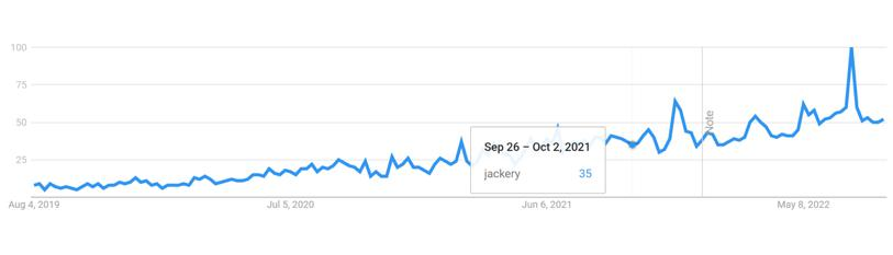 图为2019-2022年华宝新能旗下Jackey电小二品牌热度的变化,随着绿色节能理念及外部因素的影响,其声量持续上涨。