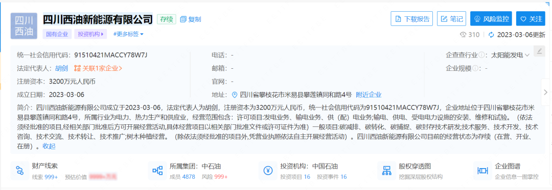 3月6日,中石油在四川成立新能源公司——四川西油新能源有限公司。企查查显示,四川西油新能源有限公司法定代表人胡剑,注册资本3200万元。公司经营范围包括发电业务、输电业务、供(配)电业务;输电、供电、受电电力设施的安装、维修和试验;碳减排、碳转化、碳捕捉、碳封存技术研发等。