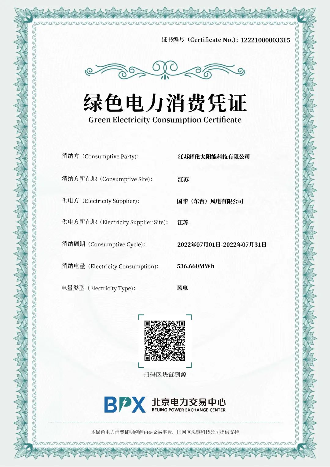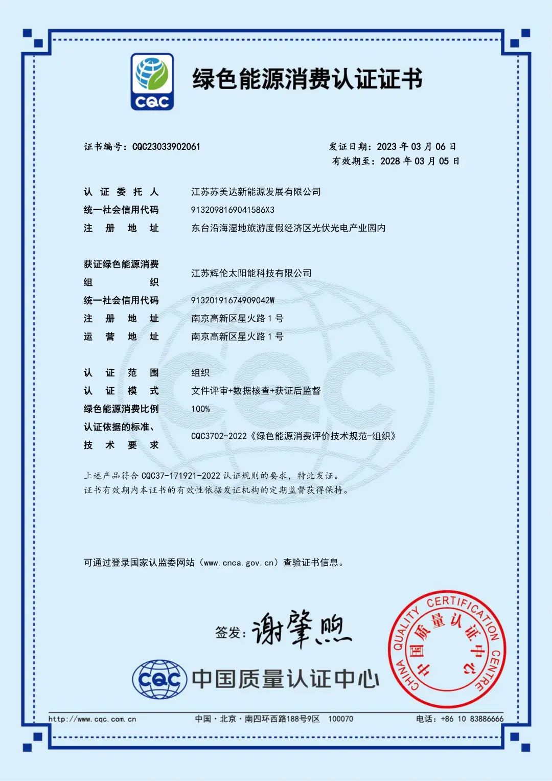 全国首张!辉伦太阳能获颁100%绿色能源消费认证证书