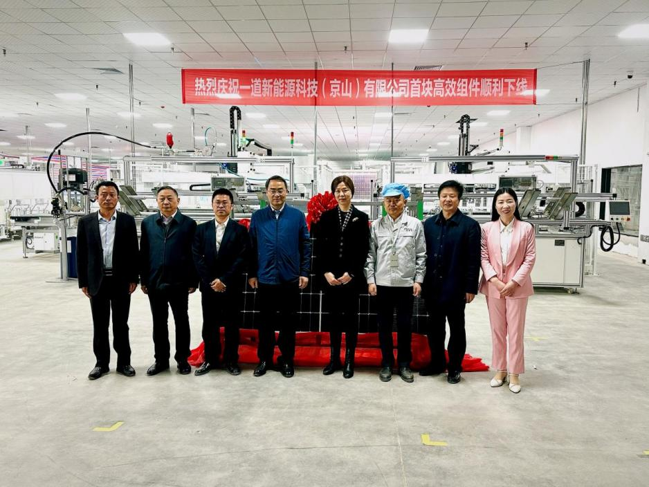 2023年3月28日,一道新能源科技(京山)有限公司(以下简称“京山基地”)首块高效组件产品顺利下线,作为华中地区最大的光伏生产基地,京山基地开启了荆楚大地绿色低碳事业的新征程。湖北省工商联主席、省总商会会长党蓁,省工商联二级巡视员薛志连,荆门市市委统战部副部长、市工商联党组书记、市总商会常务副会长兰坤,京山市市委书记张勇,一道衢州组件制造中心总经理马俊、京山基地总经理李聪、基地各部门负责人出席仪式。