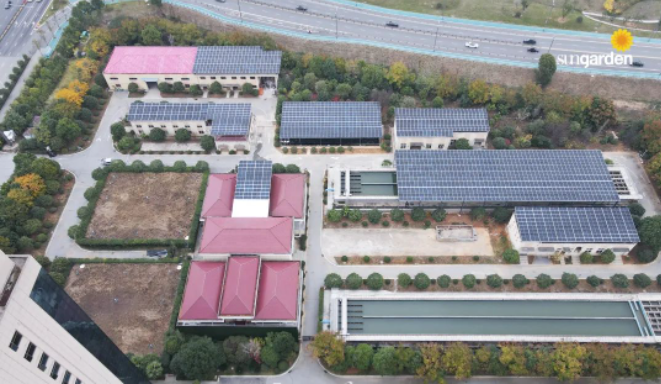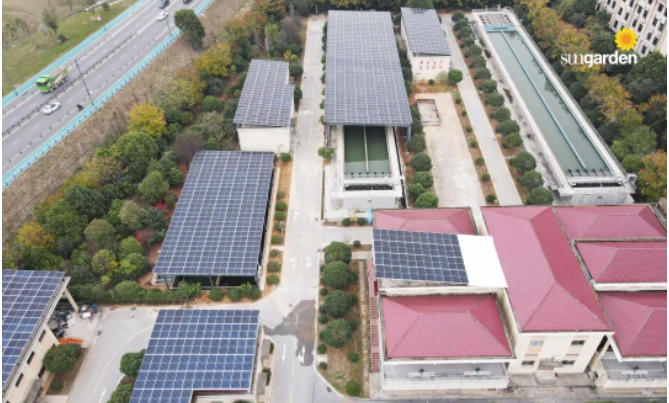 该光伏项目位于江西省鹰潭市信江新区。项目设计时,使用无人机进行勘察建模,综合考虑阴影遮挡、屋顶排水及后期运维因素,秉承“精准消纳、优化布局”的设计理念,利用水厂加药间、配电房、泵房等建筑闲置屋顶和沉淀池上方空间,总共设计安装了一千余片阿特斯高效单晶组件,装机容量达640kW。