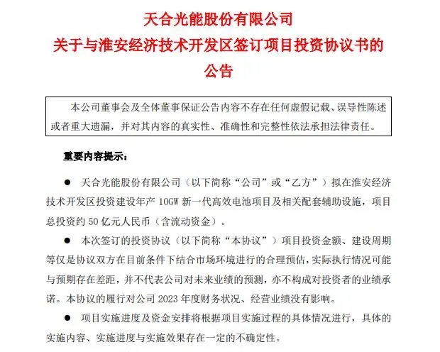 势不可挡!天合光能:拟50亿元投建年产10GW新一代高效电池项目及相关配套辅助设施