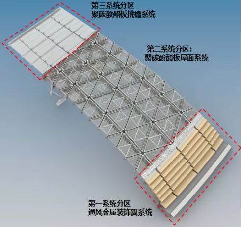 新工体屋面幕墙主要分为三大系统:通风金属装饰翼系统、聚碳酸酯板屋面系统、聚碳酸酯板挑檐系统,整体幕墙具备遮阳、照明、排集水、融雪、光伏发电和吸声降噪等功能,美观大气又实用。