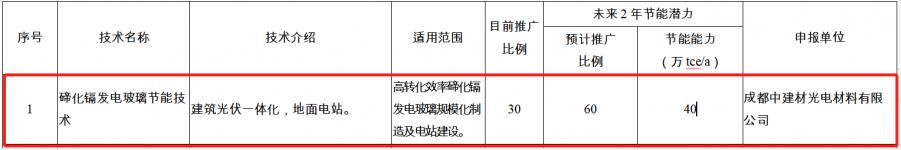 中建材碲化镉发电玻璃节能技术“入围”成都市首批节能环保技术装备推荐目录
