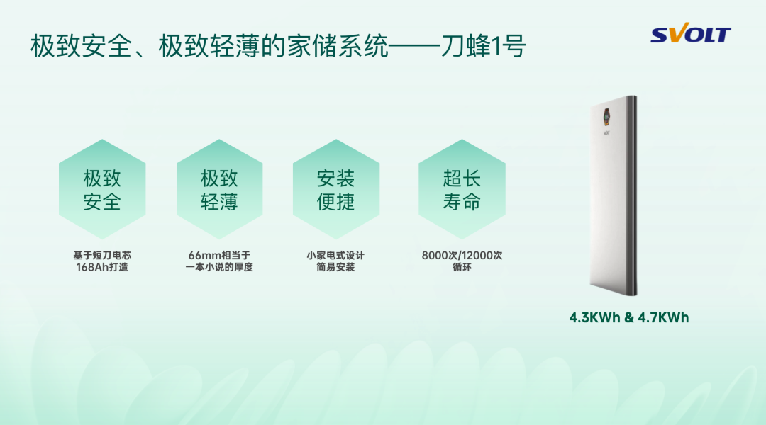 目前,家储产品普遍体积庞大、笨重、空间占用大。本次展会上,蜂巢能源基于L600型168Ah储能电芯,推出厚度仅为66mm的家用储能产品,采用短刀电芯和刀锋设计,实现了极致安全和极致轻薄,带电量有4.3KWh&4.7KWh两款可供选择,循环次数可达到12000次,产品简约、大气,像家电一样便捷、实用、美观。