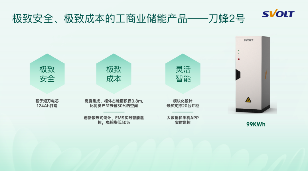 99 KWh工商一体储能则基于L600型124Ah短刀电芯开发,集电池、BMS、PCS、EMS、空调和消防系统于一体。该产品颗粒度小、功能完善、积木式拼接,应用场景更加广泛;缩小了家庭和工商业储能界限,具有高度集成、灵活扩容、高效冷却、智能监控等优势。