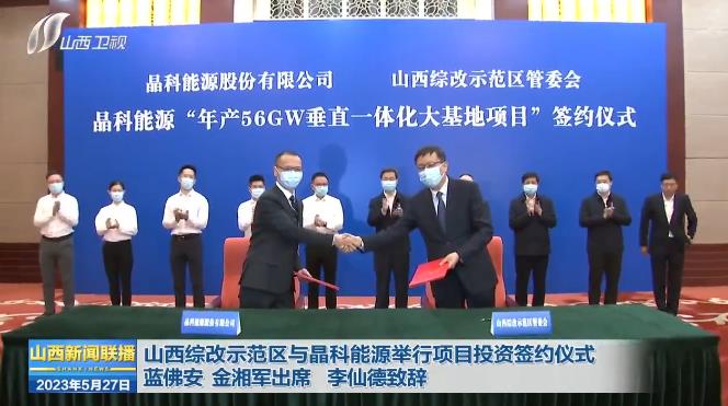 5月26日,山西综改示范区管委会与晶科能源股份有限公司在太原举行晶科能源“年产56GW垂直一体化大基地项目”投资签约仪式。省委书记蓝佛安,省委副书记、省长金湘军,省委常委、秘书长李凤岐,省委常委、太原市委书记韦韬出席。副省长汤志平、晶科能源股份有限公司董事长李仙德致辞。