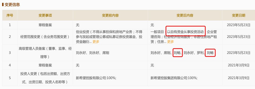 先从一则公示说起——国家企业信用信息公示系统显示,本周,新希望投资集团有限公司(简称:新希望投资集团)发生工商变更,新增刘畅为董事长、董事,公司经营范围包括“以自有资金从事投资活动”。