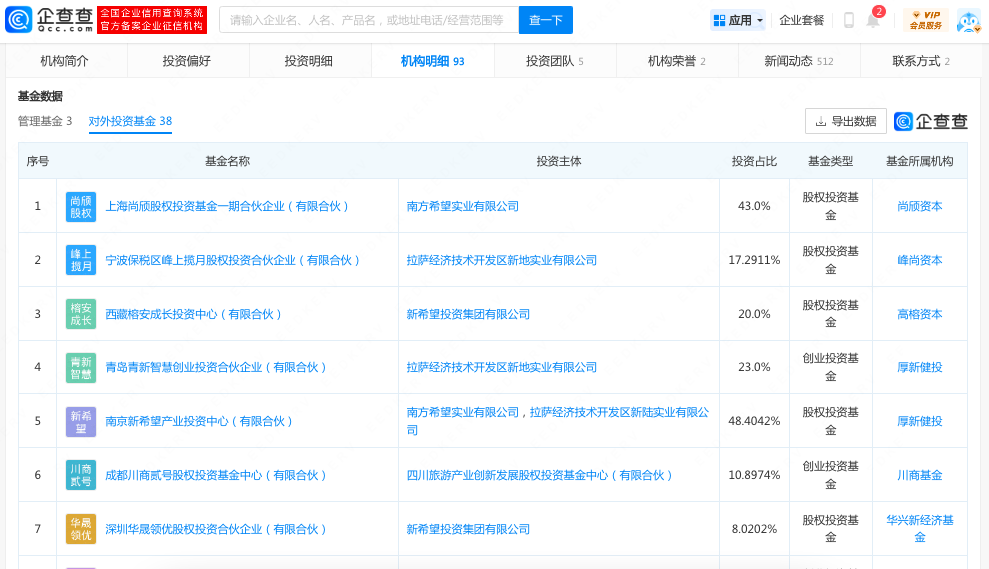 我们先从其神秘的LP身份说起。企查查APP显示,新希望对外投资基金38支,其中不乏一些在一级市场活跃的知名投资机构,包括红杉中国、高榕资本、真格基金、华兴新经济基金、顺为资本、云锋基金、基石资本、厚生投资、清流资本、尚欣资本等等。