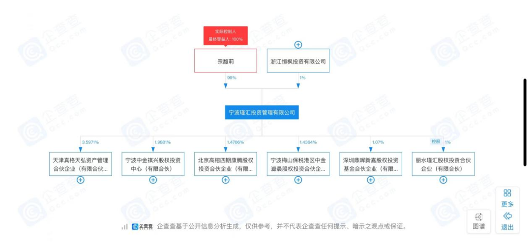 但其实女儿宗馥莉早就已经涉足VC/PE圈。企查查显示,宗馥莉名下有一支她自己实际控股的企业族群——瑾汇投资,以LP身份出资了高榕资本、真格基金、鼎晖投资、中金资本等知名投资机构。
