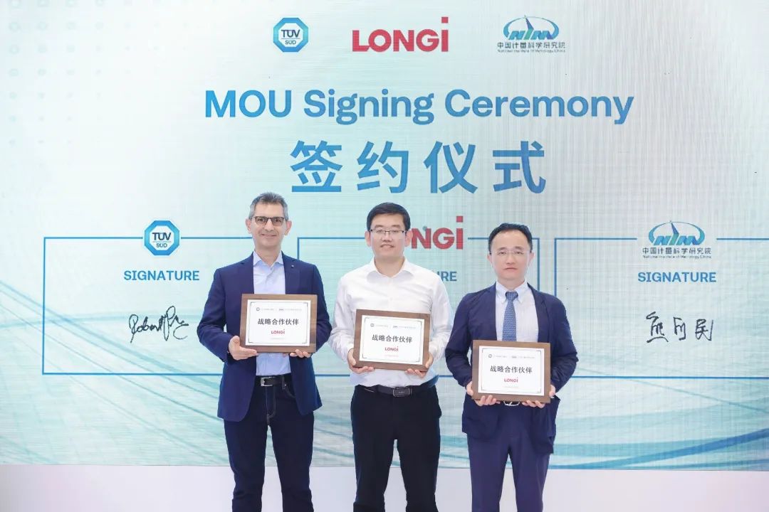 同日,TÜV南德与中国计量院、隆基绿能科技科技股份有限公司(以下简称“隆基”)达成三方战略合作协议。