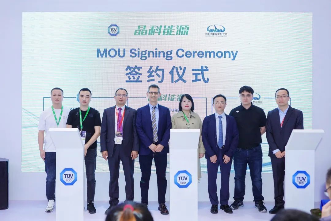 TÜV南德大中华区商业产品服务部高级副总裁Robert Puto 、TÜV南德智慧能源副总裁兼南德新能源汽车检测(江苏)有限公司总经理许海亮、中国计量院首席计量师兼研究员熊利民、晶科能源品质高级经理黄玲等嘉宾共同出席了该签约仪式。