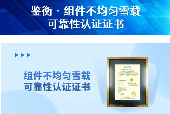 为了验证矩形硅片组件产品应用在多降雪地区的可靠性,晶澳DeepBlue 4.0 Pro在鉴衡开展了不均匀雪载测试。依据IEC 62938:2020光伏组件-不均匀雪载试验标准,在多种安装方式条件下,其最高临界雪载荷达到:6800Pa,充分证明了晶澳这款矩形硅片组件拥有优秀的抗雪载能力,获颁“组件不均匀雪载可靠性认证证书”。