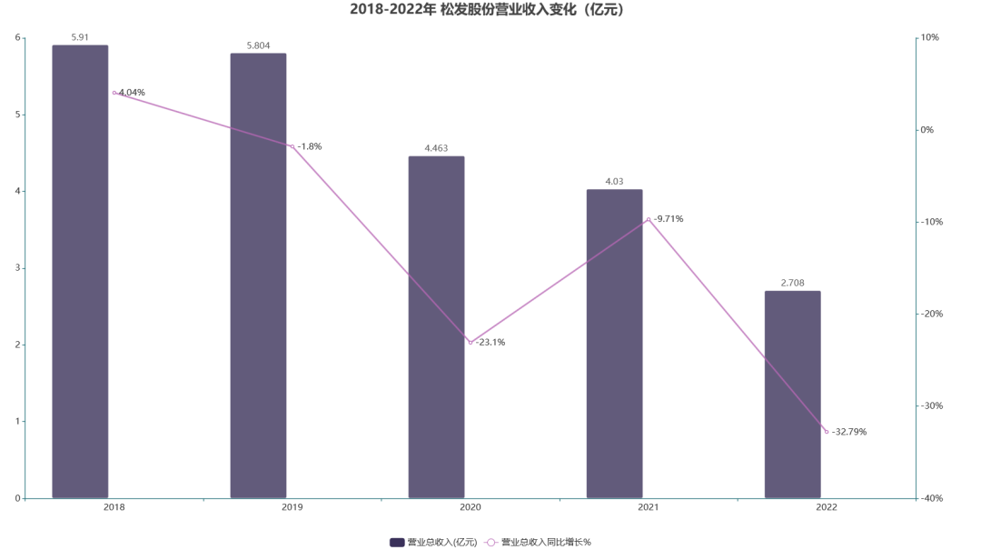 松发股份主营业务主要为陶瓷业务。然而因“行业不景气,需求萎缩订单减少,公司折价销售部分长库龄库存商品,导致业绩大幅下滑”的松发股份,五年来营业收入不断下滑,从2018年的5.68亿元一路降至2022年的2.71亿元。