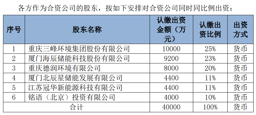 各股东方拟认缴出资人民币4亿元,其中三峰环境计划出资人民币现金1亿元、持股25%,海辰储能出资0.92亿元、持股23%,三峰环境股东德润环境出资0.8亿元、持股20%,北辰星储能和冠华新能源分别出资0.44亿元、持股11%,此外铭语投资出资0.4亿元、持股10%。