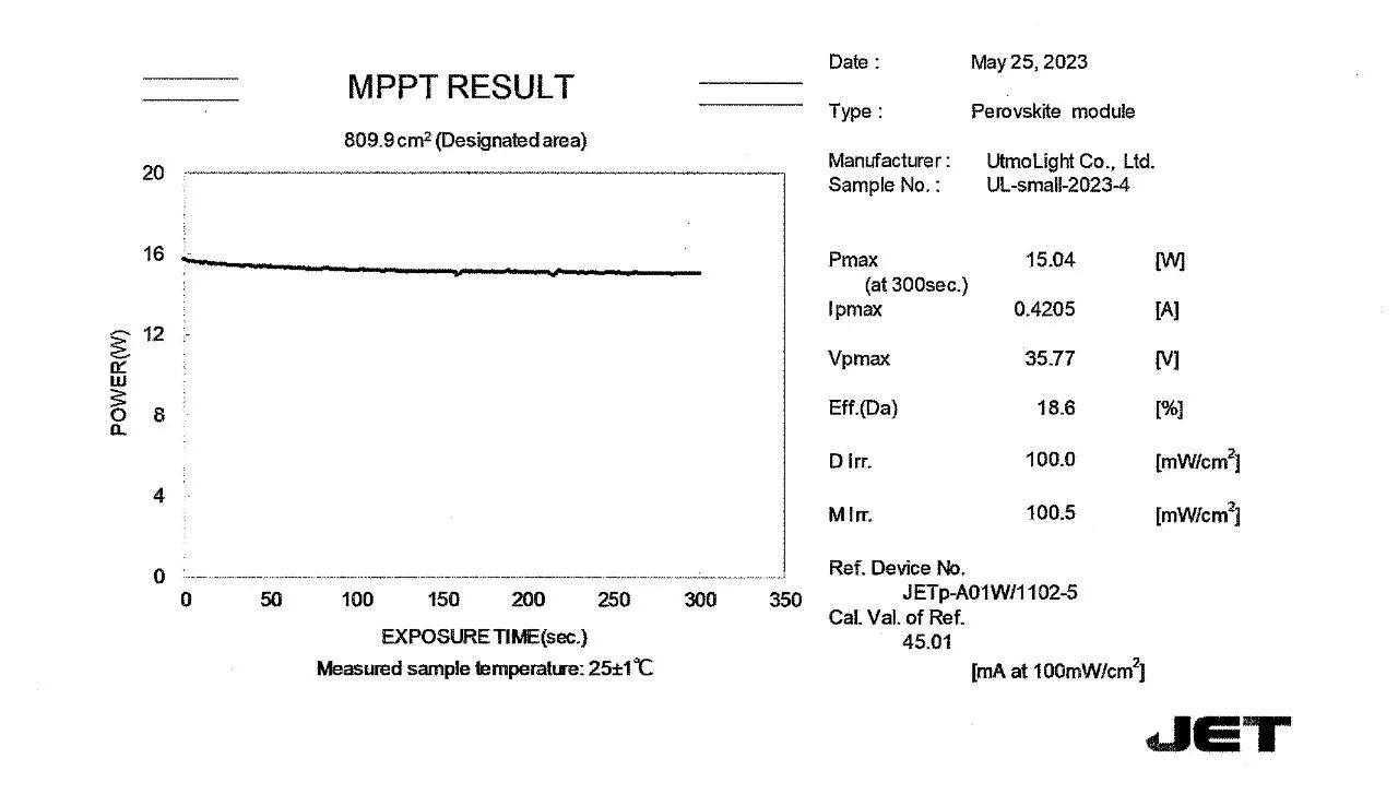 近日,在《Solar Cell Efficiency Tables》发布的2023年年中最新光伏效率纪录榜单中,极电光能809.9cm²大尺寸钙钛矿组件以18.6%的稳态效率再次创造新的世界纪录,这一结果也经过全球权威测试机构JET的严格检测认证。