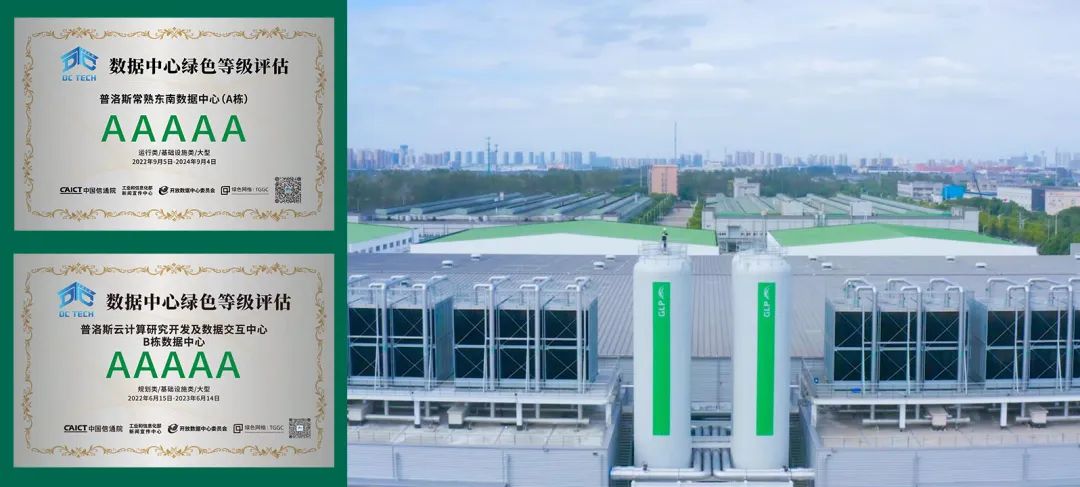 普洛斯数据中心已取得多项“数据中心绿色等级评估”体系内最高等级的5A级认证,其中普洛斯常熟东南数据中心荣获“数据中心绿色等级评估”5A级规划类认证及5A级运营类认证,摘得双5A认证。