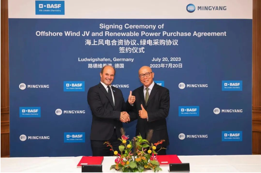 7月21日,德国路德维希港和中国湛江,巴斯夫与明阳达成协议,在华南共同建设运营海上风电场,并成立合资公司“湛江明阳巴斯夫新能源有限公司”。其中,明阳将持股90%,巴斯夫持股10%。该风电场位于广东省湛江市,总装机容量为500兆瓦。经相关部门批准后,该风电场预计将于2025年全面投入运营,其发电量将主要为巴斯夫湛江一体化基地提供可再生能源电力。