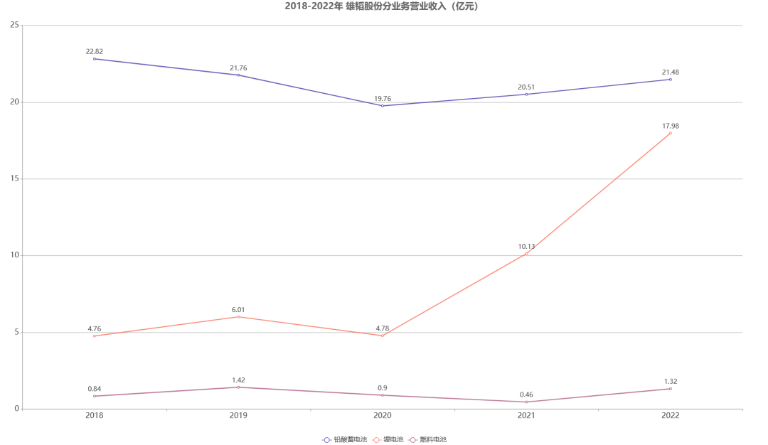 在2003年进入锂电行业以前,公司仅有单一的铅酸蓄电池业务。伴随2016年以后氢能产业链布局逐渐展开,公司当前的主营业务可分为铅酸蓄电池、锂电池、氢燃料电池三大品类。
