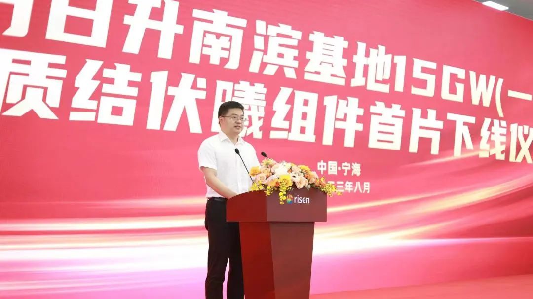 宁海县政府副县长葛仁元表示对南滨基地15GW(一期)异质结伏曦组件首片下线表示热烈祝贺。“东方日升作为全球领先的光伏制造企业,对行业发展具有超前引领性作用。此次东方日升南滨基地一期异质结伏曦组件首片下线,意味着宁海光伏产业朝千亿产业链发展又迈进了一大步。下一步,宁海县政府将全心服务企业发展,全面优化营商环境,全力助推做大做强。希望东方日升引领广大企业,深入扎根宁海、服务宁海,与宁海发展同频共振,为‘双优’新宁海建设,推进中国式现代化县域先行作出更大贡献。”