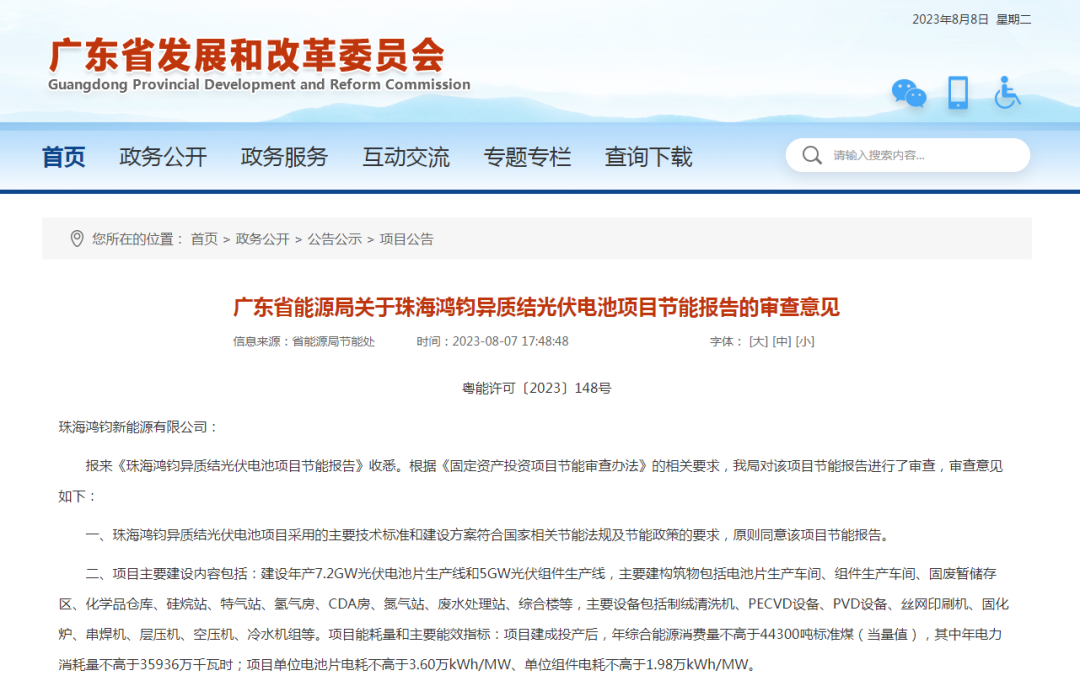8月7日,广东省发改委发布关于珠海鸿钧异质结光伏电池项目节能报告的审查意见,原则同意该项目节能报告。